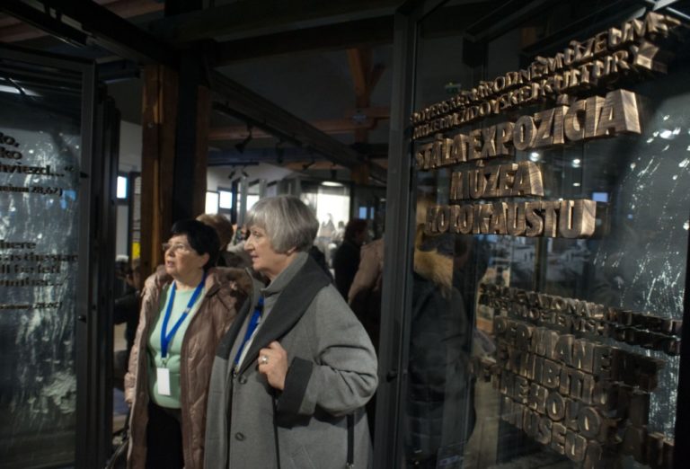 Návštevníci počas prehliadky stálej expozície Múzea holokaustu, ktoré otvorili pri príležitosti Medzinárodného dňa pamiatky obetí holokaustu (27. január). Expozíciu zriadilo Slovenské národné múzeum – Múzeum židovskej kultúry v spolupráci s Ministerstvom kultúry SR v priestoroch bývalého pracovného a koncentračného tábora na Kasárenskej ulici v Seredi. Sereď, 26. január 2016. Foto: SITA/Martin Medňanský