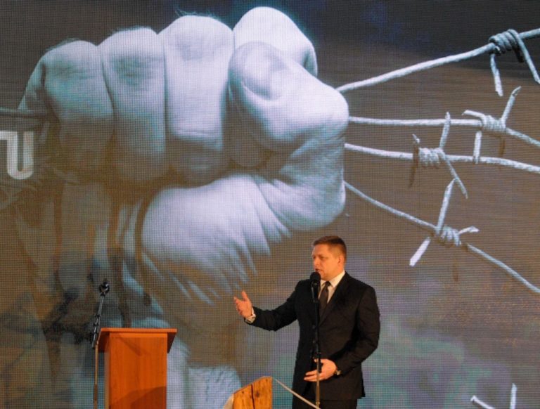 Predseda vlády SR Robert Fico počas prejavu na slávnostnom otvorení stálej expozície Múzea holokaustu pri príležitosti Medzinárodného dňa pamiatky obetí holokaustu (27. január). Sereď, 26. január 2016. Foto: SITA/Martin Medňanský