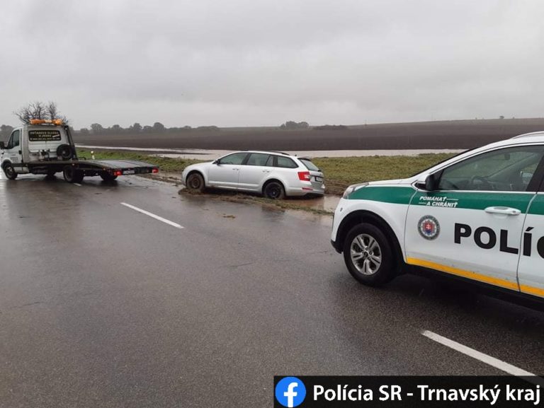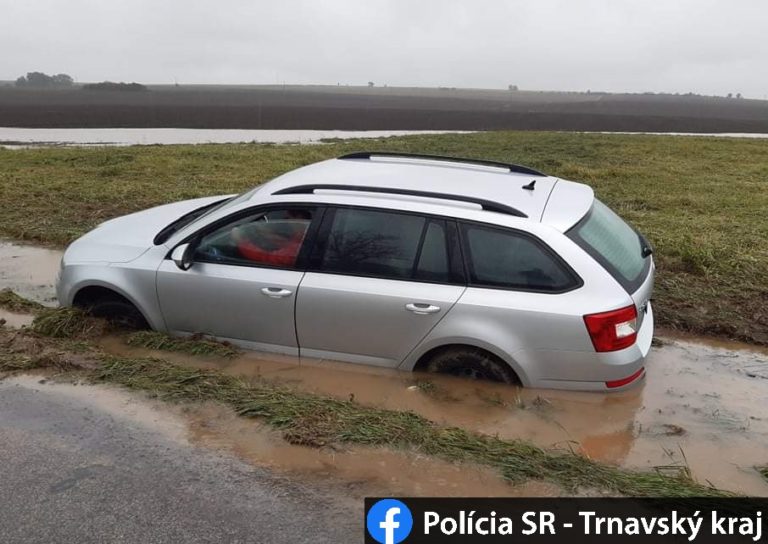 Vozidlo prechádza zatopenou cestou medzi turčianskými obcami Ivančiná a Slovenské Pravno. Rieka Turiec sa vybrežila na mnohých miestach po dlhotrvajúcich dažďoch a ohrozuje miestne komunikácie a obydlia. Ivančiná, 14. október 2020. Foto: archívne SITA/Milo Fabian