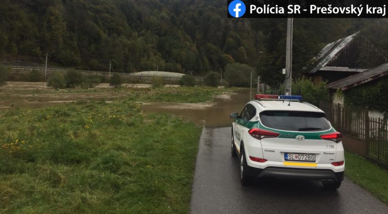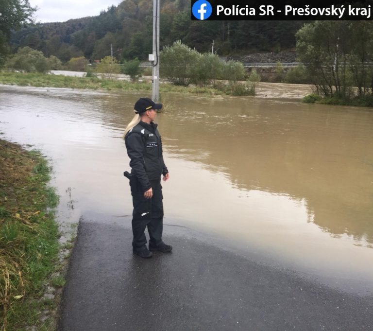 Policajti asistujú hasičom pri odstraňovaní škôd, pri evakuácii ohrozených občanov a usmerňujú dopravu na rizikových cestných úsekoch zaplavených miest. Bratislava, 14. október 2020. Foto: SITA/Polícia SR