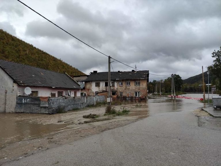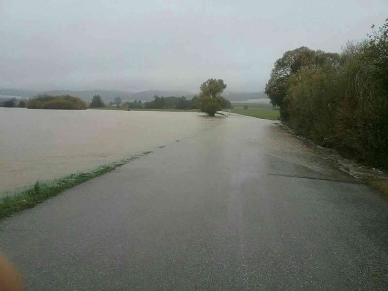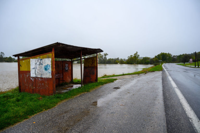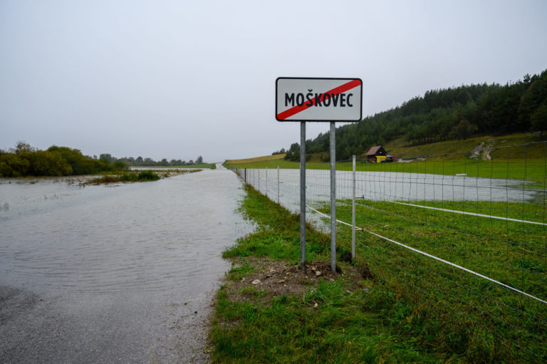 Zatopená cesta medzi turčianskými obcami Moškovec a Laclavá Rieka Turiec sa vybrežila na mnohých miestach po dlhotrvajúcich dažďoch a ohrozuje miestne komunikácie a obydlia. Moškovec, 14. október 2020. Foto: SITA/Milo Fabian