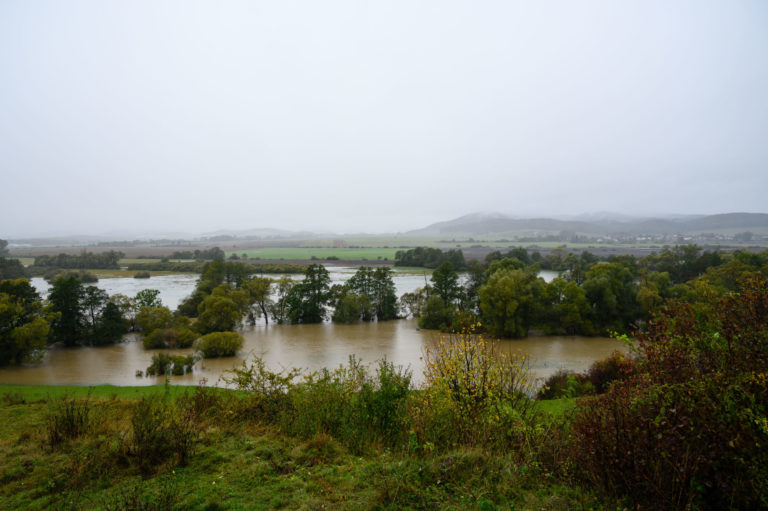 Zatopené polia pri turčianskej obci Valentová. Rieka Turiec sa vybrežila na mnohých miestach po dlhotrvajúcich dažďoch a ohrozuje miestne komunikácie a obydlia. Valentová, 14. október 2020. Foto: SITA/Milo Fabian