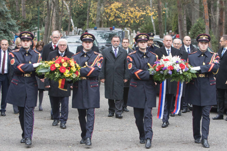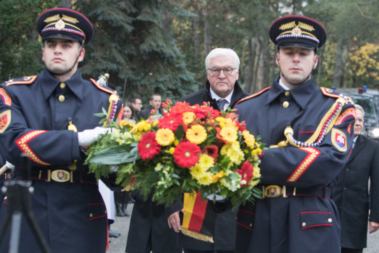 Prezident SR Andrej Kiska a nemecký spolkový prezident Frank-Walter Steinmeier počas kladenia vencov k pamätníku obetiam komunizmu na Cintoríne Vrakuňa pri príležitosti Dňa boja za slobodu a demokraciu. Bratislava, 17. november 2017. Foto: SITA/Ľudovít Vaniher.