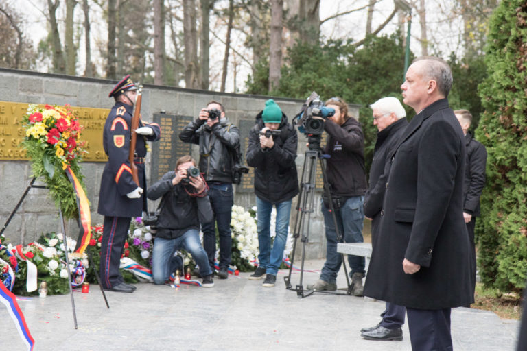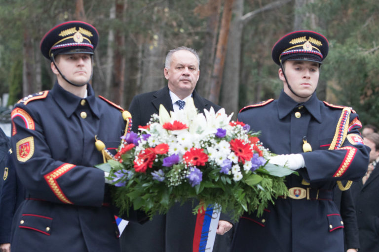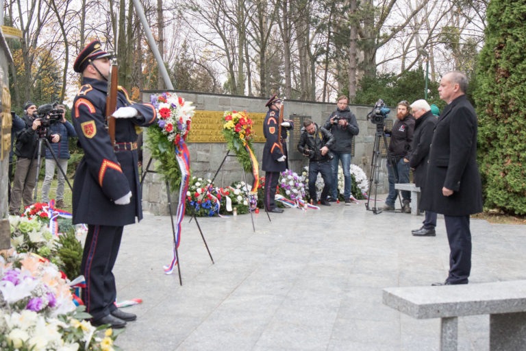 Prezident SR Andrej Kiska (uprostred) počas kladenia vencov k pamätníku obetiam komunizmu na Cintoríne Vrakuňa pri príležitosti Dňa boja za slobodu a demokraciu za účasti nemeckého spolkového prezidenta. Bratislava, 17. november 2017. Foto: SITA/Ľudovít Vaniher.