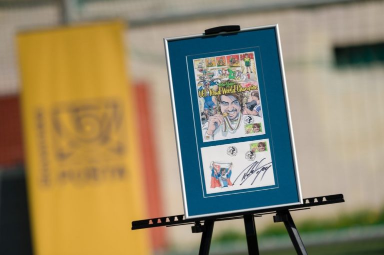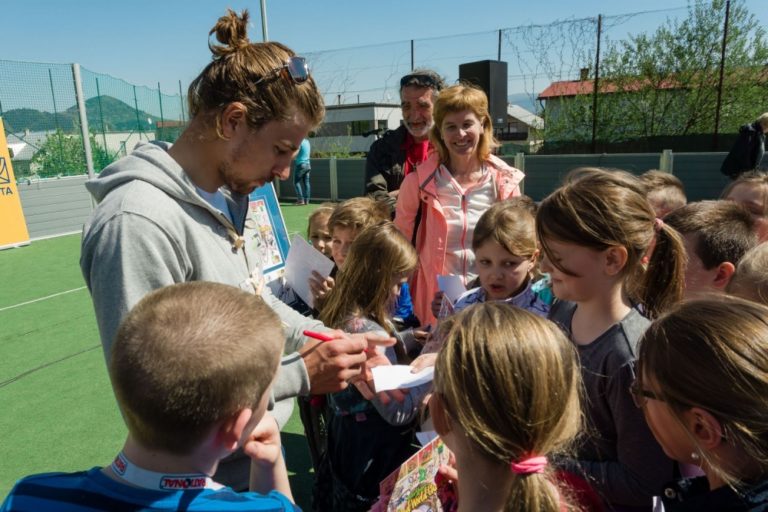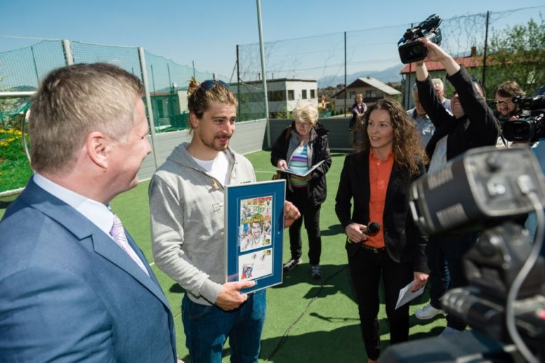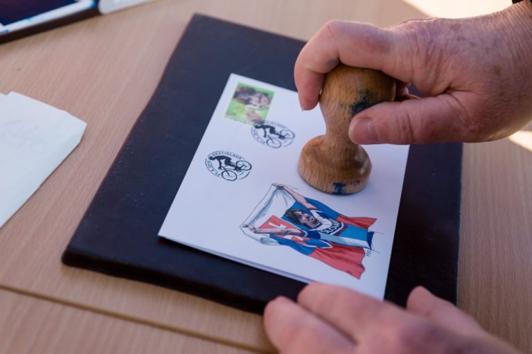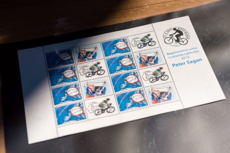 Cyklistický majster sveta Peter Sagan už má, obrazne, miesto medzi nesmrteľnými aj medzi nešportovcami. Ocitol sa totiž na poštovej známke. Slovenská pošta vo štvrtok 21. apríla 2016 oficiálne vydala známku v nominálnej hodnote 1 euro, na ktorej je vyobrazený Sagan v ruke so zlatou medailou z vlaňajšieho svetového šampionátu v americkom Richmonde. Sagan sa zúčastnil na prezentácii známky vo svojej rodnej Žiline, Autorom výtvarného návrhu známky je slovenský karikaturista Jozef Gertli Danglár. Technikou tlače je ofset. Foto: SITA/Milo Fabian
