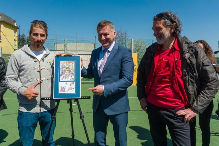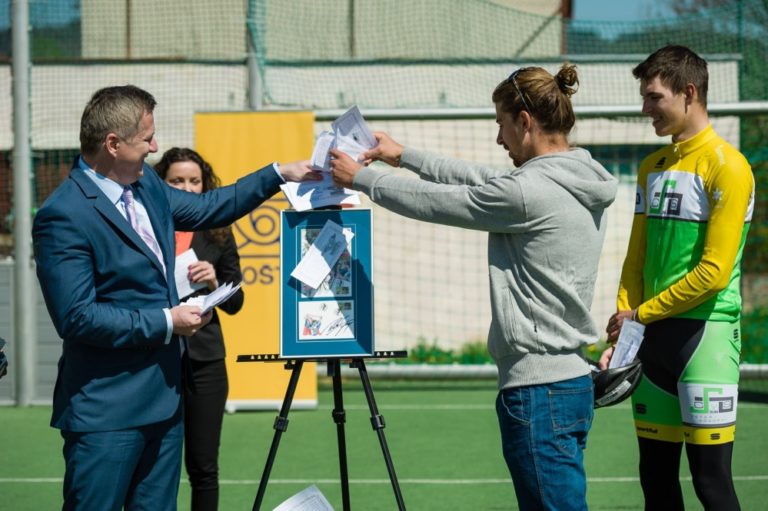 Cyklista Peter Sagan, riaditeľ Slovenskej pošty Róbert Gálik a autor grafickej predlohy poštovej známky Petra Sagana Jozef Gertli, známy ako karikaturista Danglár počas uvedenia poštovej známky cyklistu Petra Sagana. Foto: SITA/Milo Fabian