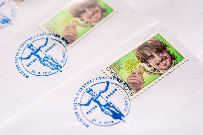 Cyklistický majster sveta Peter Sagan už má, obrazne, miesto medzi nesmrteľnými aj medzi nešportovcami. Ocitol sa totiž na poštovej známke. Slovenská pošta vo štvrtok 21. apríla 2016 oficiálne vydala známku v nominálnej hodnote 1 euro, na ktorej je vyobrazený Sagan v ruke so zlatou medailou z vlaňajšieho svetového šampionátu v americkom Richmonde. Sagan sa zúčastnil na prezentácii známky vo svojej rodnej Žiline, Autorom výtvarného návrhu známky je slovenský karikaturista Jozef Gertli Danglár. Technikou tlače je ofset.