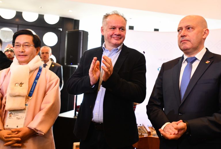 Zľava: Starosta mesta Gangneung Choi Myeoenghee, prezident SR Andrej Kiska a prezident SOV Anton Siekeľ počas slávnostného otvorenia Slovenského domu na XXIII. zimných olympijských hrách (ZOH) 2018 v Pjongčangu. Južná Kórea, Gangneung, 9. február 2018. Foto: SITA/Martin Medňanský.