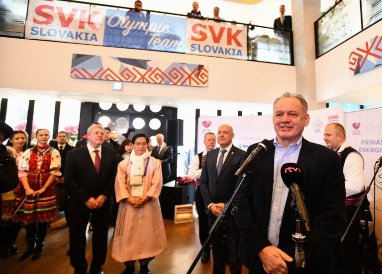 Prezident SR Andrej Kiska v príhovore (vpravo) počas slávnostného otvorenia Slovenského domu na XXIII. zimných olympijských hrách (ZOH) 2018 v Pjongčangu. Južná Kórea, Gangneung, 9. február 2018. Foto: SITA/Martin Medňanský.