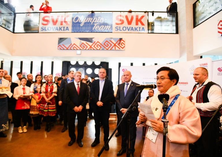 Starosta mesta Gangneung Choi Myeoenghee v príhovore (vpravo) počas slávnostného otvorenia Slovenského domu na XXIII. zimných olympijských hrách (ZOH) 2018 v Pjongčangu. Južná Kórea, Gangneung, 9. február 2018. Foto: SITA/Martin Medňanský.