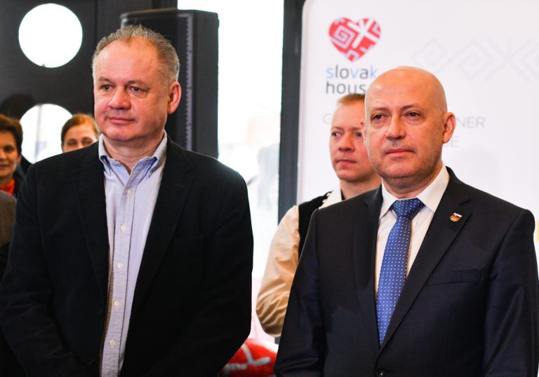 Zľava: Prezident SR Andrej Kiska a prezident SOV Anton Siekeľ počas slávnostného otvorenia Slovenského domu na XXIII. zimných olympijských hrách (ZOH) 2018 v Pjongčangu. Južná Kórea, Gangneung, 9. február 2018. Foto: SITA/Martin Medňanský.