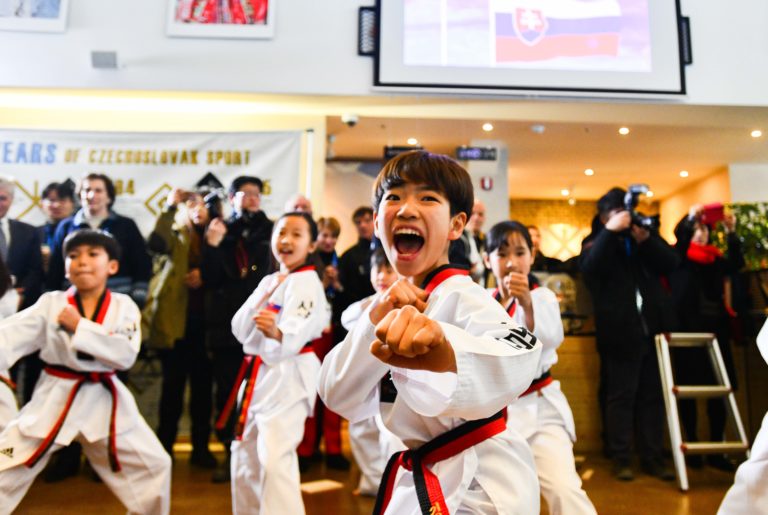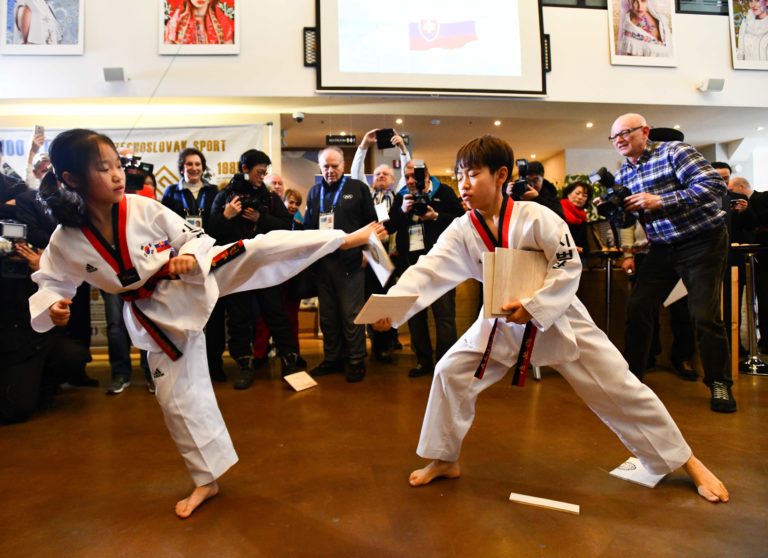 Ukážka tradičného juhokórejského bojového umenia taekwondo počas slávnostného otvorenia Slovenského domu na XXIII. zimných olympijských hrách (ZOH) 2018 v Pjongčangu. Južná Kórea, Gangneung, 9. február 2018. Foto: SITA/Martin Medňanský.
