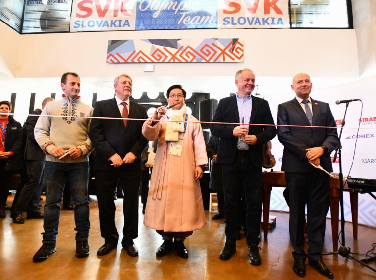 Zľava: Veľvyslanec SR v Kórejskej republike Milan Lajčiak, starosta mesta Gangneung Choi Myeoenghee, prezident SR Andrej Kiska a prezident SOV Anton Siekeľ počas slávnostného otvorenia Slovenského domu na XXIII. zimných olympijských hrách (ZOH) 2018 v Pjongčangu. Južná Kórea, Gangneung, 9. február 2018. Foto: SITA/Martin Medňanský.
