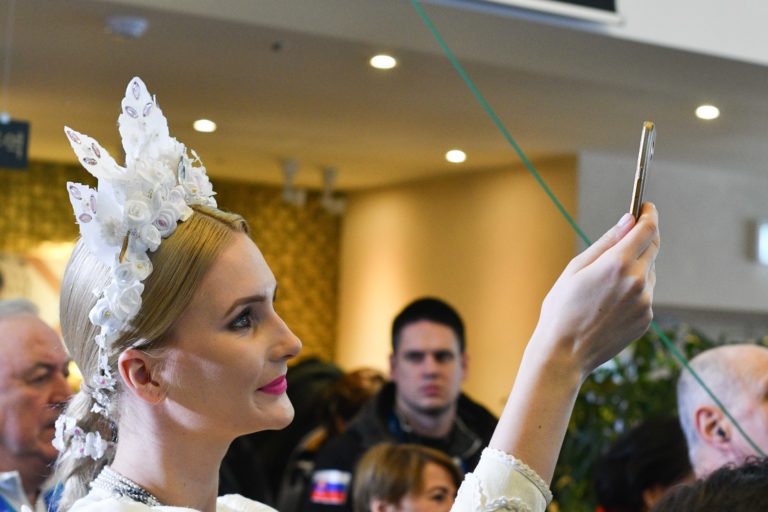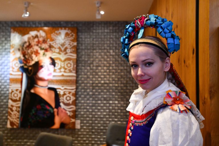 Žena v slovenskom kroji počas slávnostného otvorenia Slovenského domu na XXIII. zimných olympijských hrách (ZOH) 2018 v Pjongčangu. Južná Kórea, Gangneung, 9. február 2018. Foto: SITA/Martin Medňanský.