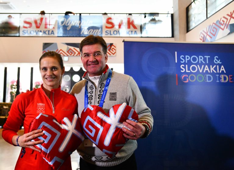 Zľava: Členka MOV Danka Barteková a predseda Valného zhromaždenia OSN a minister zahraničných vecí a európskych záležitostí SR Miroslav Lajčák v Slovenskom dome pred začiatkom XXIII. zimných olympijských hier (ZOH) 2018 v Pjongčangu. Južná Kórea, Gangneung, 9. február 2018. Foto: SITA/Martin Medňanský.