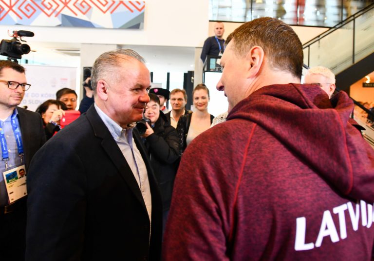 Zľava v popredí: Prezident SR Andrej Kiska a prezident Lotyšska Raimonds Véjonis počas počas otvorenia Slovenského domu na XXIII. zimných olympijských hrách (ZOH) 2018 v Pjongčangu. Južná Kórea, Gangneung, 9. február 2018. Foto: SITA/Martin Medňanský.