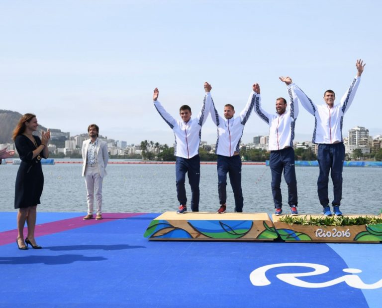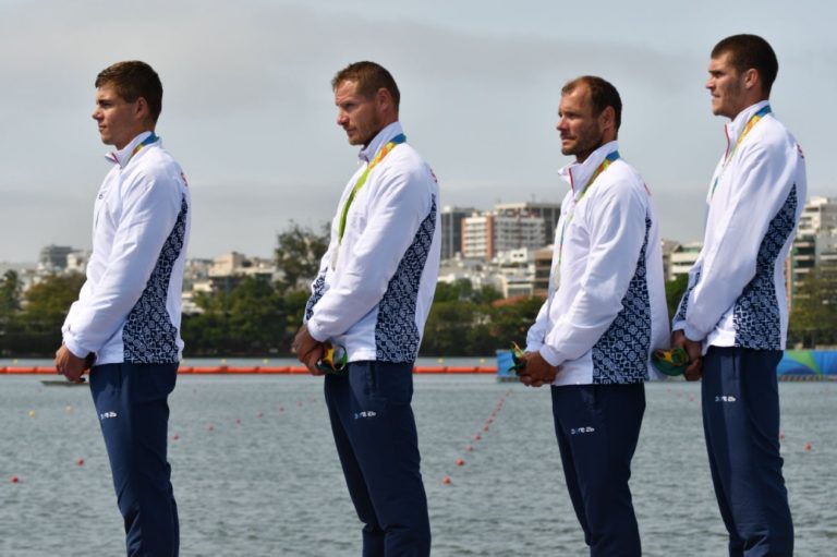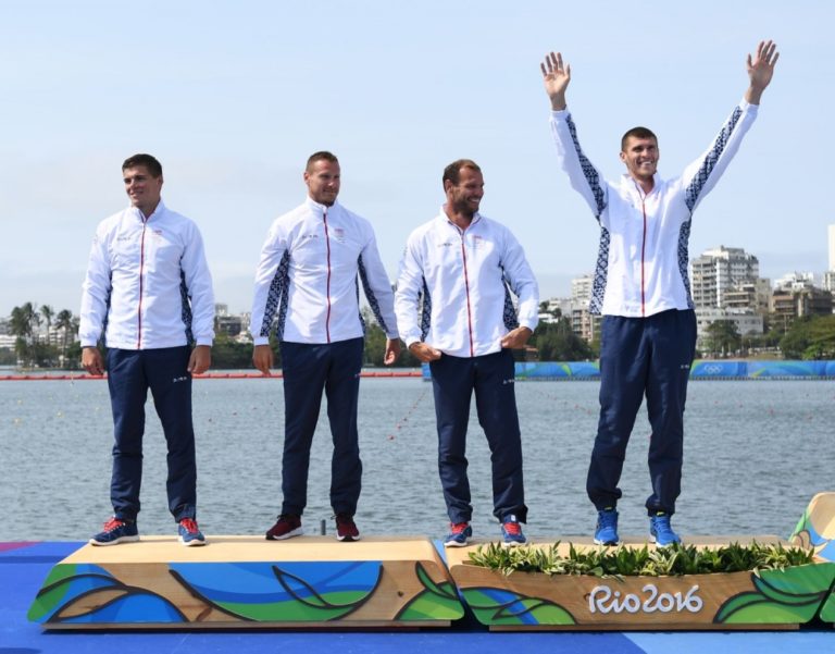 Slovenskí reprezentanti v rýchlostnej kanoistike, zľava: Denis Myšák, Erik Vlček, Juraj Tarr a Tibor Linka počas medailového ceremoniálu v kategórii K4 mužov na 1000 m. Rio de Janeiro, 20. august 2016. Foto: SITA/Martin Medňanský