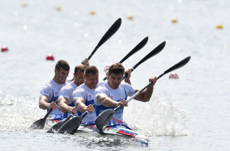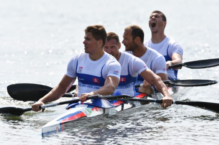 Slovenskí reprezentanti v rýchlostnej kanoistike, sprava: Denis Myšák, Erik Vlček, Juraj Tarr a Tibor Linka počas finále v kategórii K4 mužov na 1000 m. Rio de Janeiro, 20. august 2016. Foto: SITA/Martin Medňanský