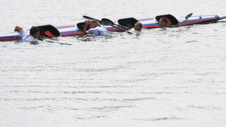 Slovenskí reprezentanti v rýchlostnej kanoistike, zľava: Denis Myšák, Erik Vlček, Juraj Tarr a Tibor Linka v cieli finále kategórie K4 mužov na 1000 m. Rio de Janeiro, 20. august 2016. Foto: SITA/Martin Medňanský