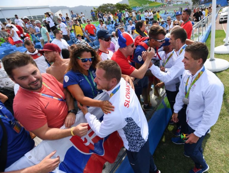 Radosť slovenských reprezentantov v rýchlostnej kanoistike kategórie K4 mužov na 1000 m so slovenskými fanúšikmi po medailovom ceremoniáli na letných OH 2016. Rio de Janeiro, 20. august 2016. Foto: SITA/Martin Medňanský