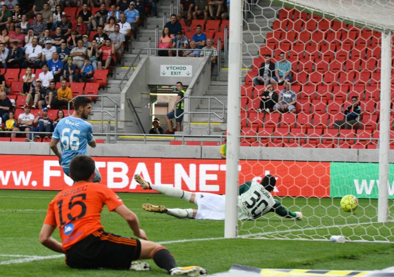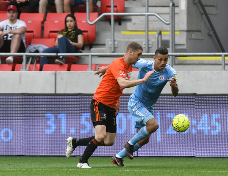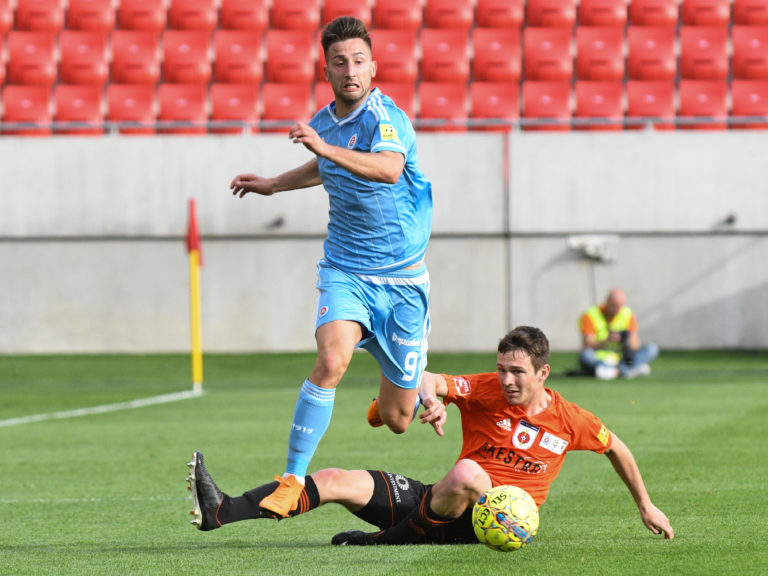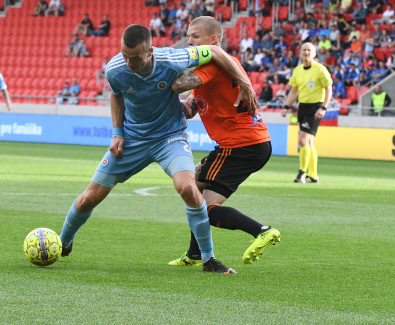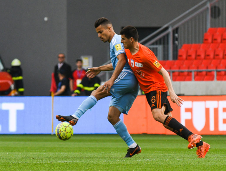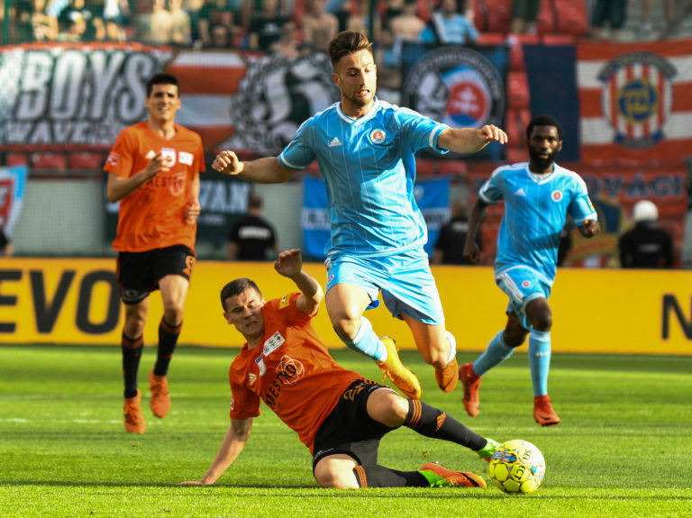 Zľava: Andraž Šporar z ŠK Slovan Bratislava a Michal Jonec z MFK Ružomberok počas finálového zápasu Slovnaft Cupe. Trnava, 1. máj 2018. Foto: SITA/Martin Medňanský.