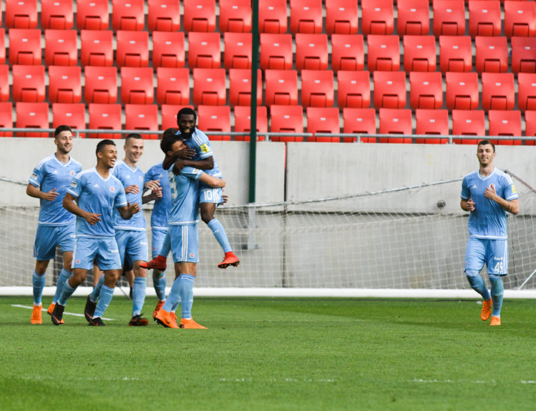 Radosť hráčov ŠK Slovan Bratislava po góle do siete MFK Ružomberok počas finálového zápasu Slovnaft Cupu. Trnava, 1. máj 2018. Foto: SITA/Martin Medňanský.