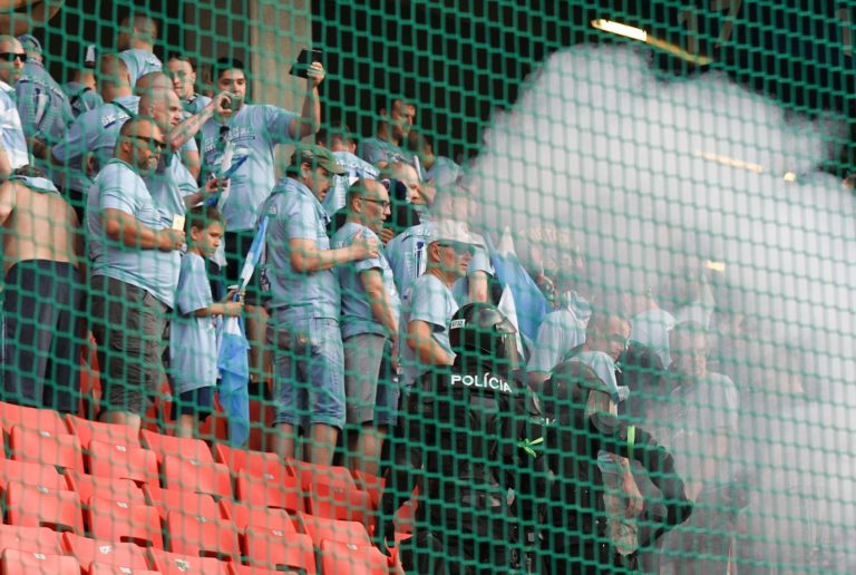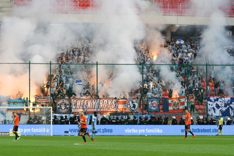 Pyrotechnika v sektore fanúšikov "belasých" počas finálového zápasu Slovnaft Cupu medzi ŠK Slovan Bratislava a MFK Ružomberok. Trnava, 1. máj 2018. Foto: SITA/Martin Medňanský.