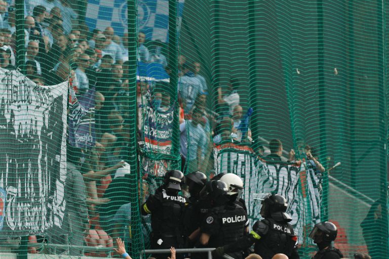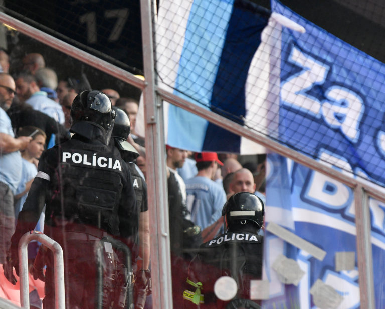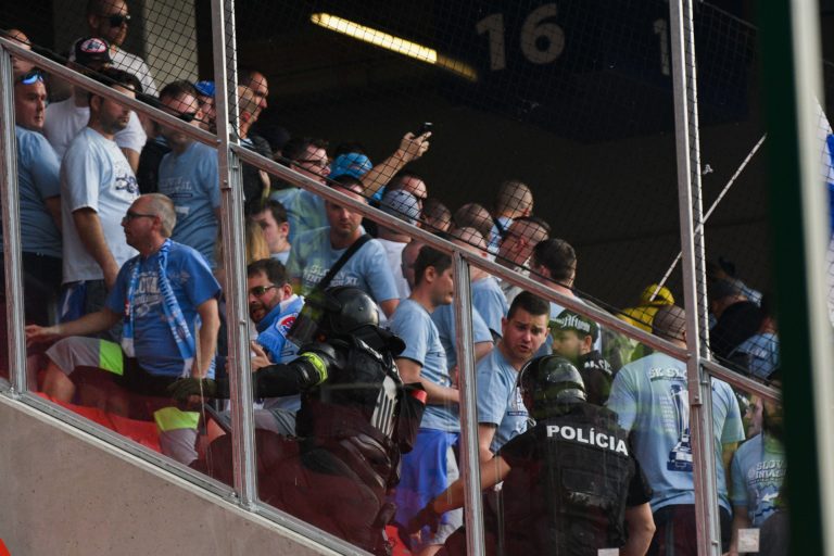 Polícia v sektore fanúšikov "belasých" počas finále Slovnaft Cupu medzi ŠK Slovan Bratislava a MFK Ružomberok. Trnava, 1. máj 2018. Foto: SITA/Martin Medňanský.