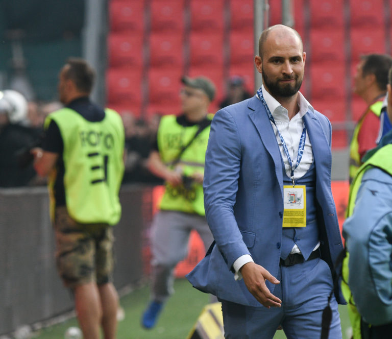 Viceprezident a generálny riaditeľ ŠK Slovan Bratislava Ivan Kmotrík ml. počas finálového zápasu Slovnaft Cupu. Trnava, 1. máj 2018. Foto: SITA/Martin Medňanský.
