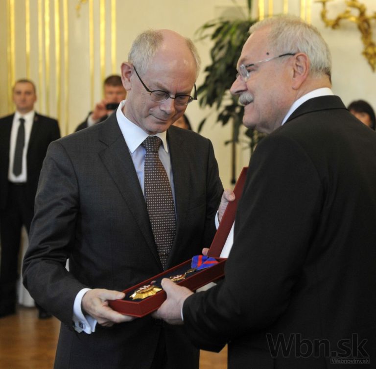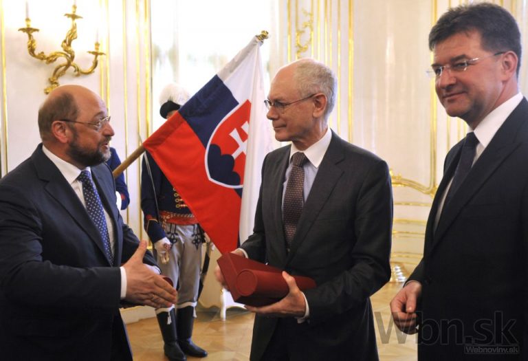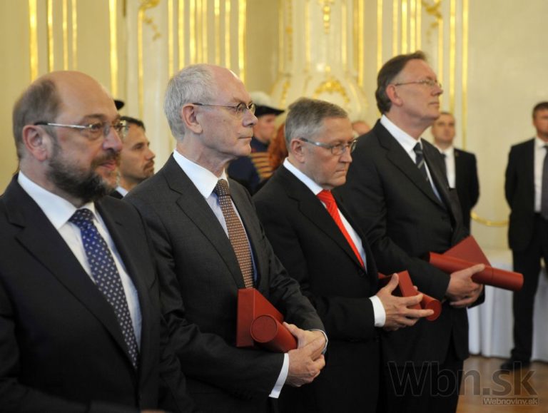 Zľava: Predseda Európskeho parlamentu Martin Schulz, predseda Európskej rady Herman Van Rompuy a minister zahraničných vecí a európskych záležitostí Miroslav Lajčák počas udeľovania štátnych vyznamenaní Radu Bieleho dvojkríža II. triedy predstaviteľom inštitúcií Európskej únie pri príležitosti 10. výročia vstupu Slovenskej republiky do EÚ. Foto: SITA/Ján Slovák