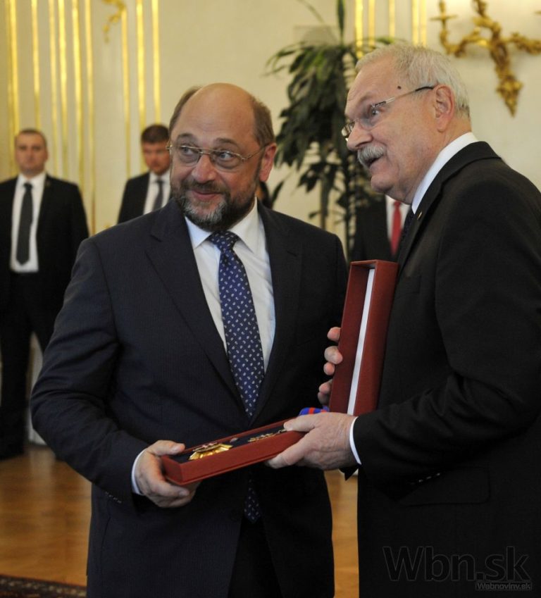 Zľava: Predseda Európskeho parlamentu Martin Schulz a prezident SR Ivan Gašparovič počas udeľovania štátnych vyznamenaní Radu Bieleho dvojkríža II. triedy predstaviteľom inštitúcií Európskej únie pri príležitosti 10. výročia vstupu Slovenskej republiky do EÚ. Foto: SITA/Ján Slovák