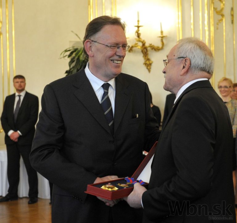 Zľava: Bývalý spravodajca Európskeho parlamentu Jan Marinus Wiersma a prezident SR Ivan Gašprovič počas udeľovania štátnych vyznamenaní Radu Bieleho dvojkríža II. triedy predstaviteľom inštitúcií Európskej únie pri príležitosti 10. výročia vstupu Slovenskej republiky do EÚ. Foto: SITA/Ján Slovák