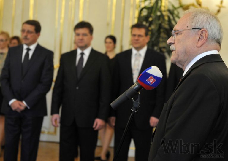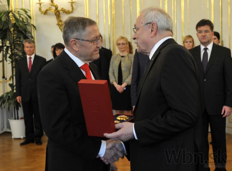 Zľava: Generálny riaditeľ Európskeho fondu finančnej stability, bývalý generálny riaditeľ Direktoriátu EK pre ekonomické a finančné záležitosti Klaus Regling a prezident SR Ivan Gašparovič počas udeľovania štátnych vyznamenaní Radu Bieleho dvojkríža II. triedy predstaviteľom inštitúcií Európskej únie pri príležitosti 10. výročia vstupu Slovenskej republiky do EÚ. Foto: SITA/Ján Slovák