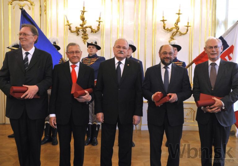 Zľava: Bývalý spravodajca Európskeho parlamentu Jan Marinus Wiersma, generálny riaditeľ Európskeho fondu finančnej stability, bývalý generálny riaditeľ Direktoriátu EK pre ekonomické a finančné záležitosti Klaus Regling, prezident SR Ivan Gašparovič, predseda Európskeho parlamentu Martin Schulz a predseda Európskej rady Herman Van Rompuy počas udeľovania štátnych vyznamenaní Radu Bieleho dvojkríža II. triedy predstaviteľom inštitúcií Európskej únie pri príležitosti 10. výročia vstupu Slovenskej republiky do EÚ. Foto: SITA/Ján Slovák