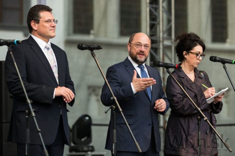 Zľava: Podpredseda Európskej komisie Maroš Šefčovič a prezident Európskeho parlamentu Martin Schulz počas oficiálnych osláv 10. výročia vstupu Slovenskej republiky do Európskej únie. Foto: SITA/Jozef Jakubčo