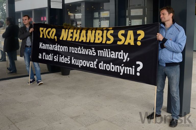 Predseda Obyčajných ľudí a nezávislých osobností (OĽaNO) Igor Matovič drží transparent s nápisom: 'Fico, nehanbíš sa? Kamarátom rozdávaš miliardy a ľudí si ideš kupovať drobnými?' pred bratislavským hotelom, kde sa konal pracovný snem Smeru. Bratislava, 23. máj 2015. Foto: SITA/Robert Tappert