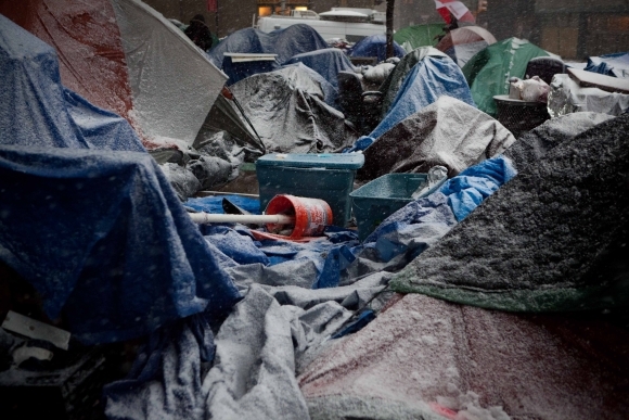 Aktivisti z hnutia Obsaďte Wall Street prežili v Zucotti parku veľmi chladnú noc. Foto: SITA/AP