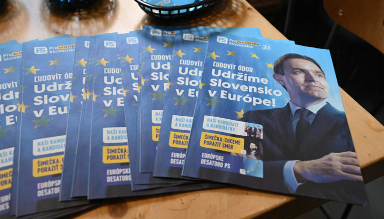 Líder kandidátky Progresívneho Slovenska vo voľbách do Európskeho parlamentu (EP) Ľudovít Ódor na titulnej strane letáku pred začatím snemu hnutia Progresívne Slovensko (PS) v Tabačke Kulturpark v Košiciach. Košice, 4. máj 2024. Foto: SITA/Viktor Zamborský