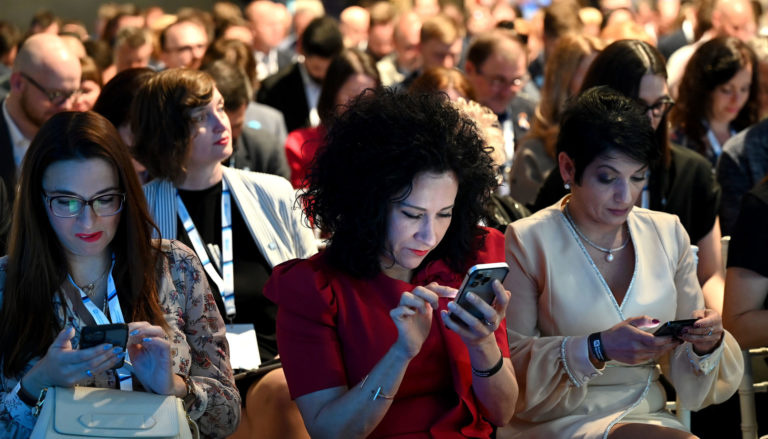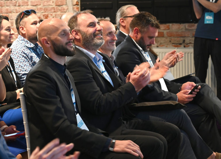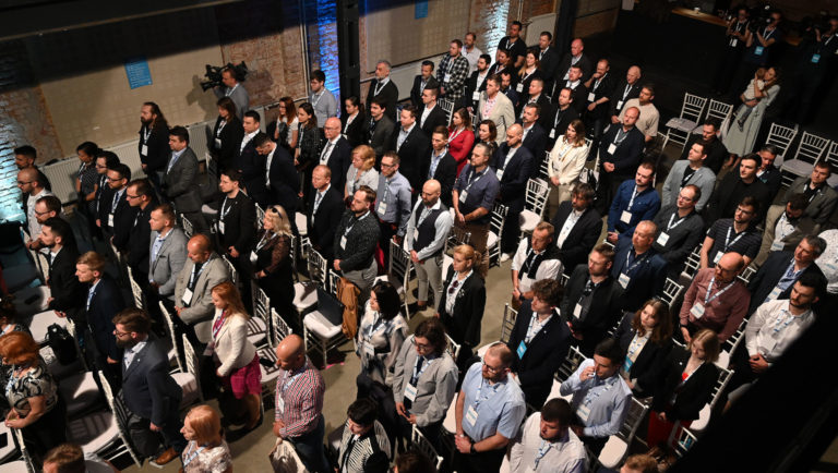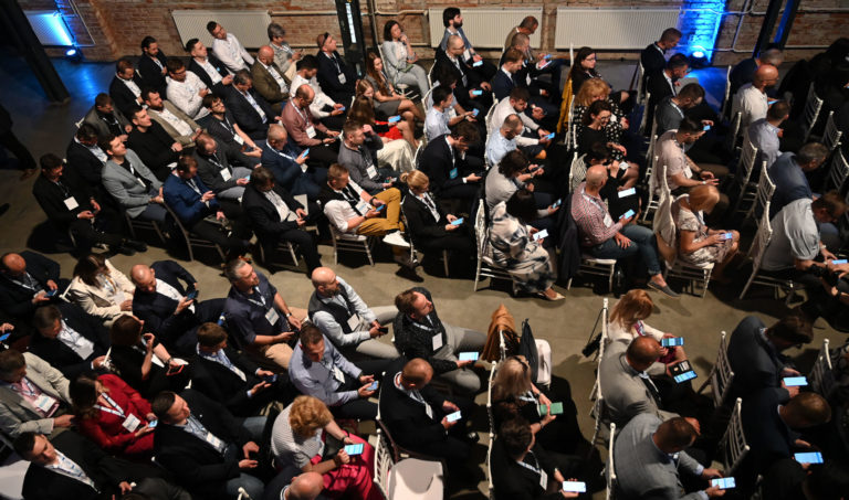 Delegáti počas otvorenia snemu hnutia Progresívne Slovensko (PS) v Tabačke Kulturfabrik v Košiciach. Košice, 4. máj 2024. Foto: SITA/Viktor Zamborský