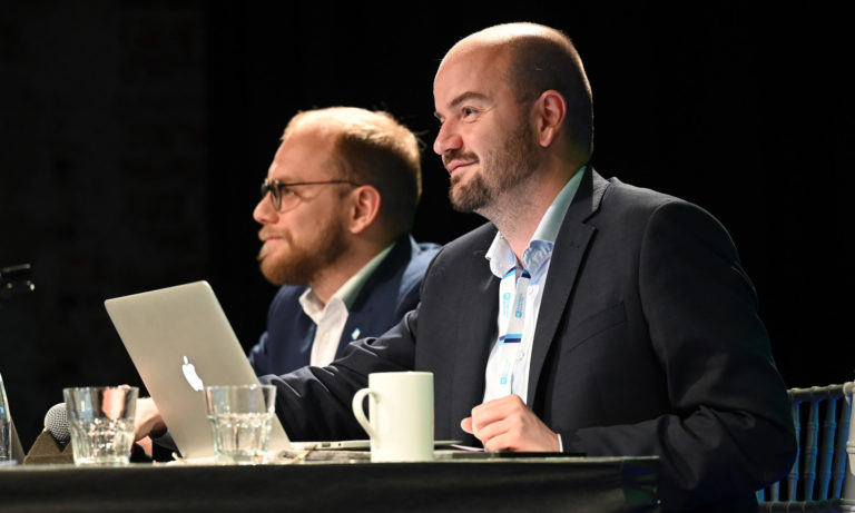 Zľava: Generálny manažér PS Jerguš Ridzoň a predseda poslaneckého klubu PS, poslanec NR SR Martin Dubéci počas otvorenia snenu hnutia Progresívne Slovensko (PS) v Tabačke Kulturfabrik v Košiciach. Košice, 4. máj 2024. Foto: SITA/Viktor Zamborský