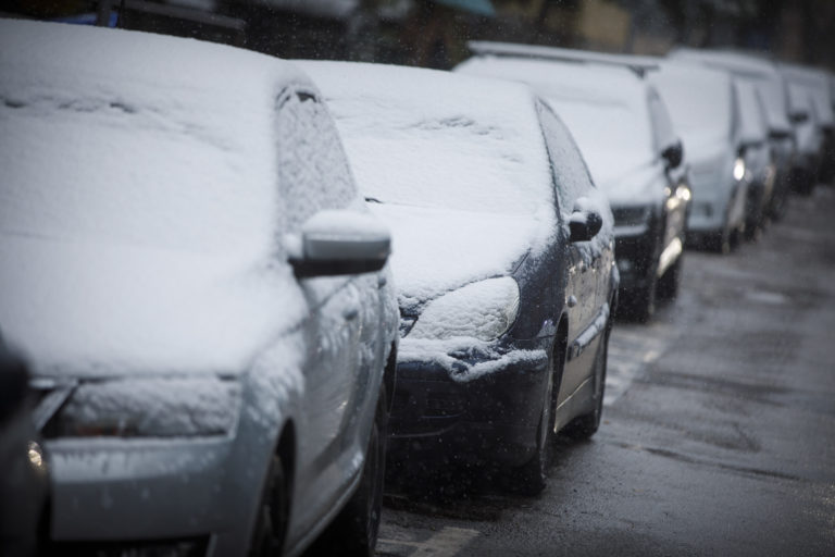 Zasnežené autá v MČ Staré Mesto počas prvého sezónneho sneženia v Bratislave. Bratislava, 2. december 2019. Foto: SITA/Branislav Bibel.