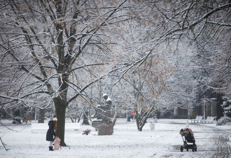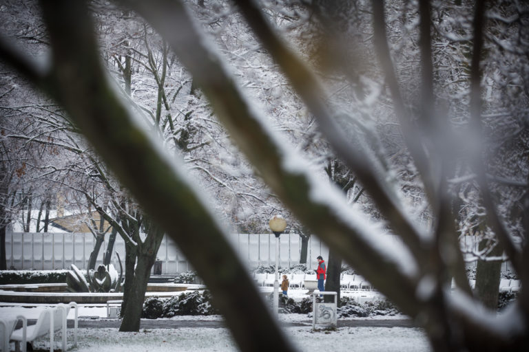 Návštevníci v Medickej záhrade počas prvého sezónneho sneženia v Bratislave. Bratislava, 2. december 2019. Foto: SITA/Branislav Bibel.