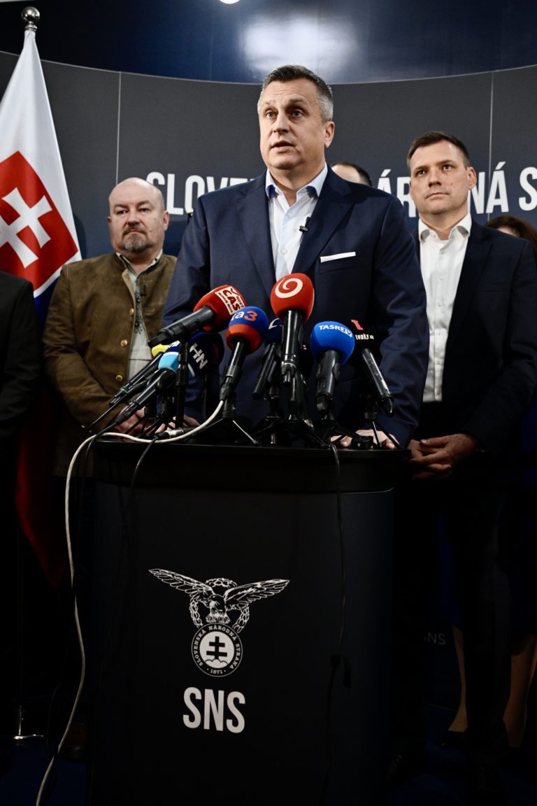 Zvolení poslanci parlamentu za stranu Slovenská národná strana (SNS), zľava: Peter Kotlár, Rudolf Huliak, predseda SNS Andrej Danko, novozvolený minister životného prostredia SR Tomáš Taraba a podpredseda SNS a člen Predsedníctva SNS Ján Krišanda počas tlačovej besedy Slovenskej národnej strany (SNS). Foto: archívne, SITA/Milan Illík