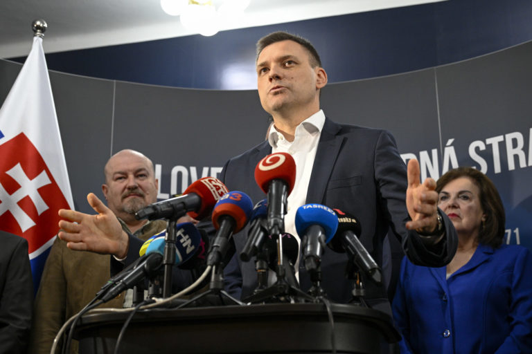 Zvolení poslanci parlamentu za stranu Slovenská národná strana (SNS), zľava: Rudolf Huliak, predseda SNS Andrej Danko a novozvolený minister životného prostredia SR Tomáš Taraba počaa tlačovej besedy Slovenskej národnej strany (SNS) v centrále strany na tému: Problematika vzniku vlády. Bratislava, 24. október 2023. Foto: SITA/Milan Illík