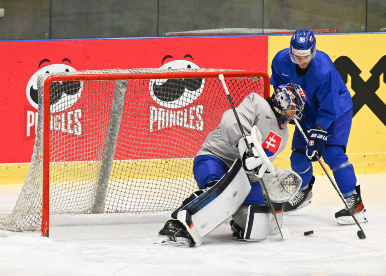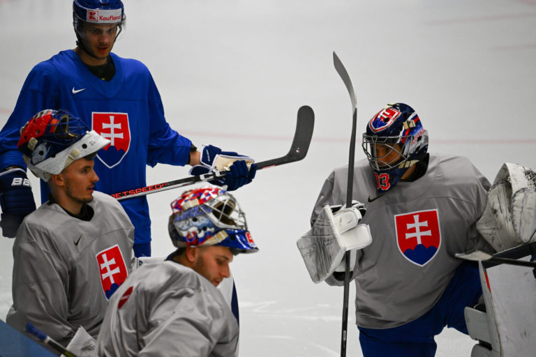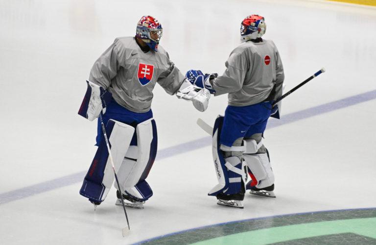 Sprava: Brankári Matej Tomek a Samuel Hlavaj počas oficiálneho tréningu tímu Slovenska v rámci majstrovstiev sveta v ľadovom hokeji 2024 v Českej republike. Ostrava, Česká republika, 11. máj 2024. Foto: SITA/Martin Medňanský.