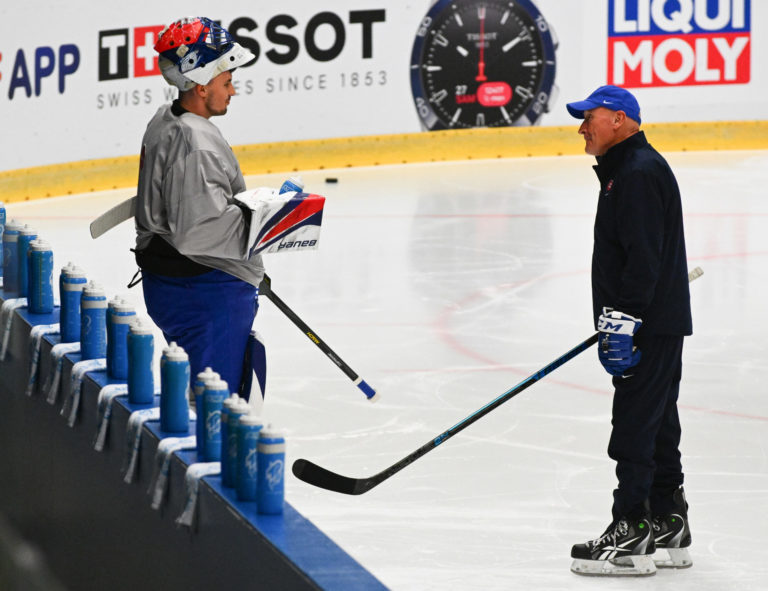 Sprava: Tréner hokejistov Slovenska Craig Ramsey a brankár Matej Tomek počas oficiálneho tréningu tímu Slovenska v rámci majstrovstiev sveta v ľadovom hokeji 2024 v Českej republike. Ostrava, Česká republika, 11. máj 2024. Foto: SITA/Martin Medňanský.