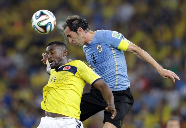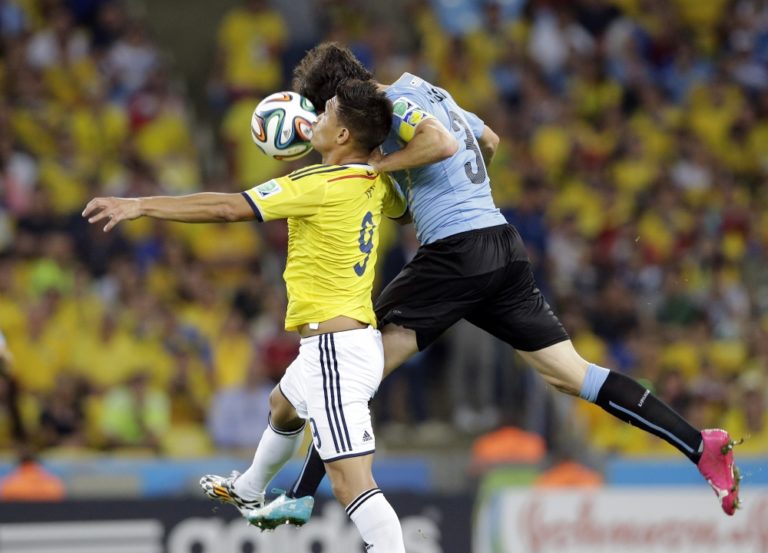 Uruguajčan Diego Godin v súboji s kolumbijským futbalistom Jacksonom Martinezom počas sobotňajšieho osemfinálového zápasu na svetovom šampionáte v Brazílii. Foto: SITA/AP