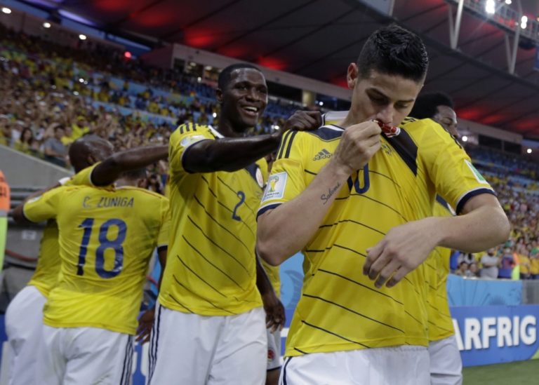 Ofenzívny stredopoliar James Rodriguez strelil oba góly Kolumbie v sobotňajšom osemfinálovom zápase na svetovom šampionáte v Brazílii. Foto: SITA/AP