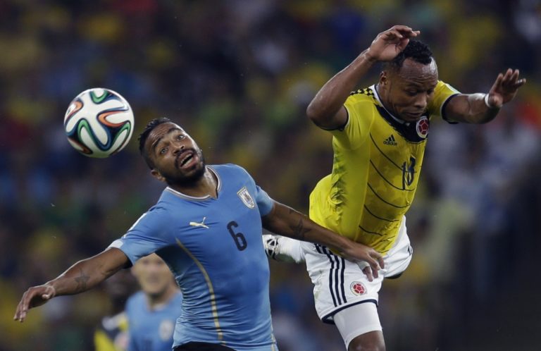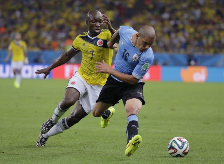 Uruguajčan Egidio Arevalo Rios v súboji s kolumbijským futbalistom Juanom Cuadradom počas sobotňajšieho osemfinálového zápasu na svetovom šampionáte v Brazílii. Foto: SITA/AP