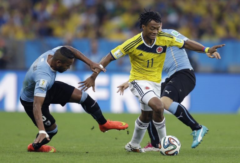 Kolumbijčan Juan Cuadrado v súboji s uruguajskými futbalistami počas sobotňajšieho osemfinálového zápasu na svetovom šampionáte v Brazílii. Foto: SITA/AP